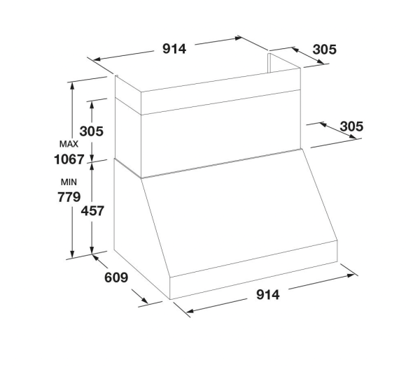 36 tum väggmonterad fläkt för SOFIA 48 tum spisar: Fettfilter, LED belysning, kapacitet: 1453 m3/h, 73 dBa, dubbel-motor, minimum rör diameter 200mm